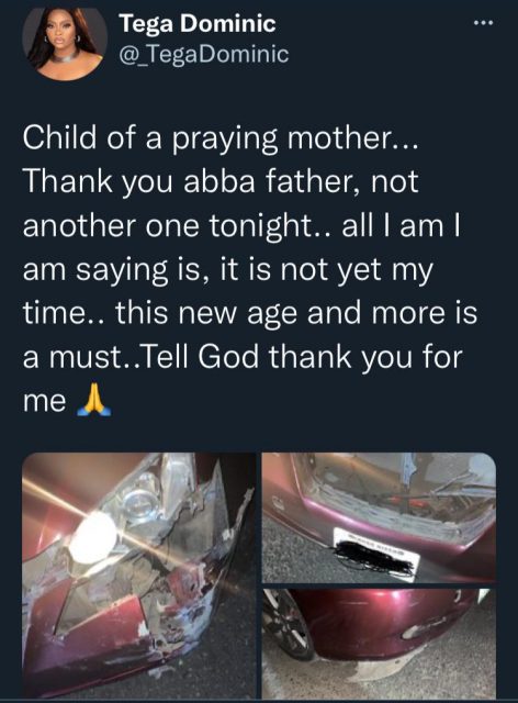 Reality TV show star, Tega Dominic expresses gratitude after narrowly surviving a car accident in Lagos.