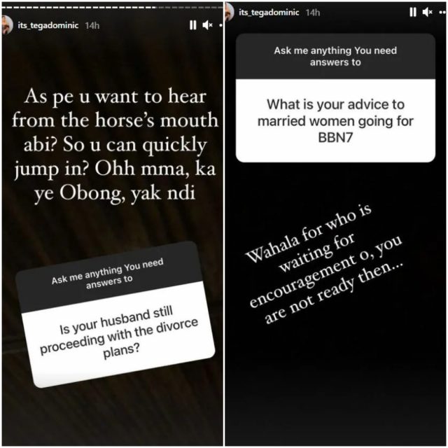 Reality TV star Tega has replied Instagram followers who asked if she and her husband are still together.