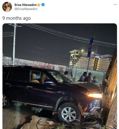 Erica shared a photo from the accident scene and captioned it, “9 months ago”.
