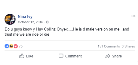 “Do u guys know y I luv Collinz Onyex…..He is d male version on me ..and trust me we are ride or die,” she wrote.