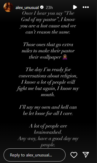 Alex voiced her opposition to the popular phrase “the God of my pastor,” stating she is completely against anyone who uses it. She went further to condemn those who idolize their pastors to the extent of using their pictures as phone or gadget wallpapers.