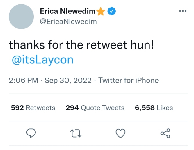 The BBNaija star tagged him and simply wrote; ”thanks for the retweet hun! @itsLaycon”