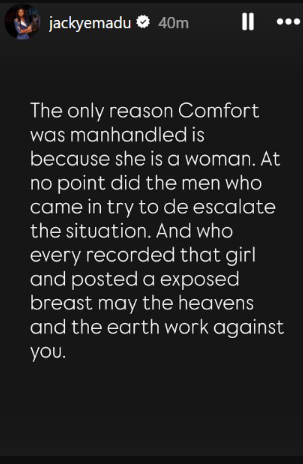 Big Brother Naija star Jacky Madu has reacted to the viral incident involving Comfort, the female passenger allegedly manhandled by Ibom Air staff after slapping an air hostess.