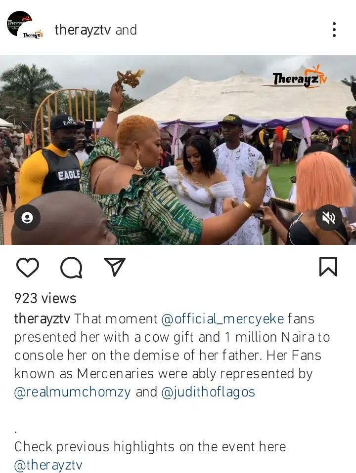 Mercy Eke’s fans popularly known as Mercenaries melted her heart when they presented her with 1 million naira cash and a cow.