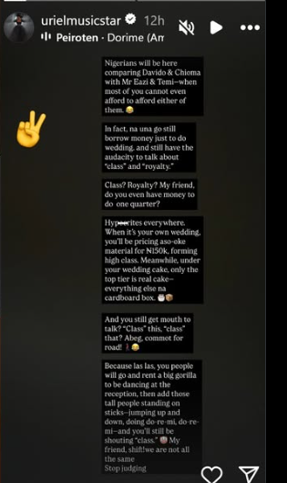Taking to her Instagram stories, Uriel criticized those making class and royalty debates about the two high-profile ceremonies, stressing that many of them cannot afford to live the lifestyles of the celebrities they are discussing.