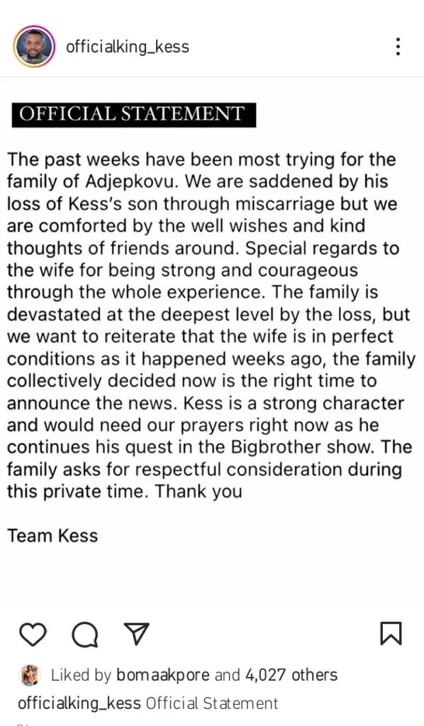 “The past weeks has been most trying for the family of Adepkovu. We are saddened by his loss of Kess’s son through miscarriage but we are comforted by the well wishes and kind thoughts of friends around. Special regards to the wife for being strong and courageous through the whole experience. The family is devastated at the deepest level by the loss, but we want to reiterate that the wife is in perfect condition as it happened weeks ago, the family collectively decided now is the right time to announce the news. Kess is a strong character and would need our prayers right now as he continues his quest in the Big Brother show. The family asks for respectful consideration during this private time. Thank you”.