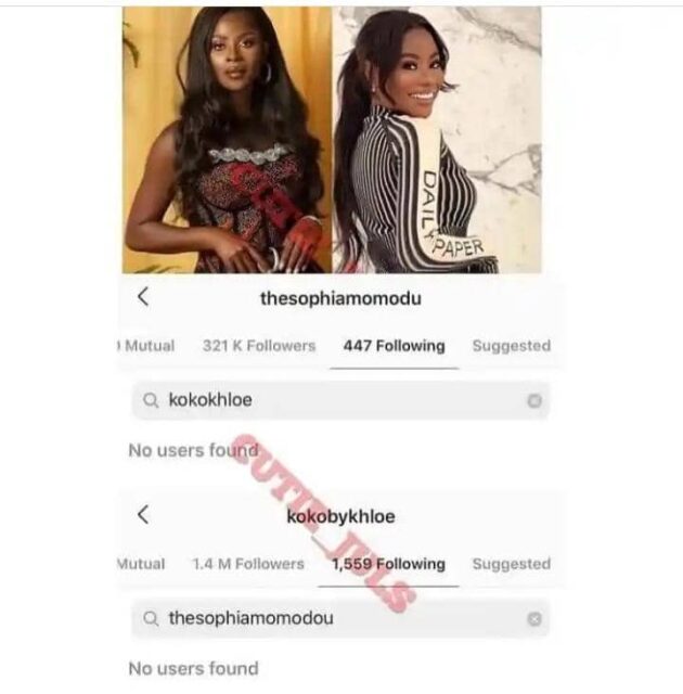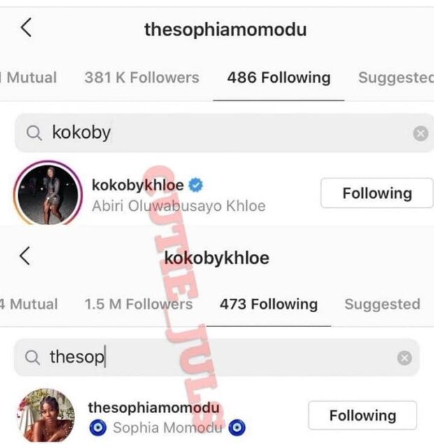 Reality TV star, Khloe and Sophia Momodu have finally smoked the peace pipe as they follow each other once again on the gram after fighting each other silently over something we don’t know.