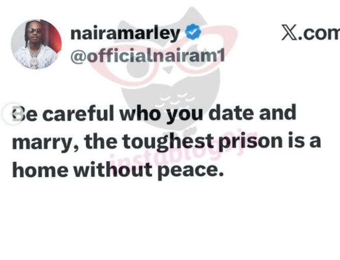 - Singer Naira Marley has advised fans to be cautious about who they date and marry, warning that a troubled home is like living in the toughest prison.