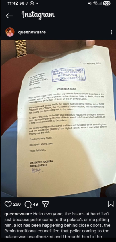 Controversy has continued to trail the recent visit of popular streamer Peller to the palace of Oba Ewuare II in Benin City, as the Benin Queen moved to defend the visit with an official letter.