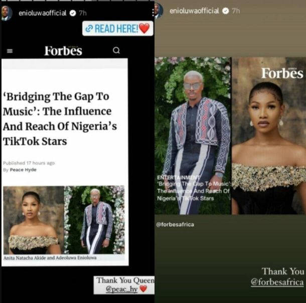 Enioluwa thanked the magazine for considering him worthy on his Instagram story.