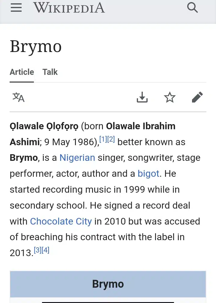 The buzz which Brymo’s recent tweet about his idea of the political future of the Igbos generated, has seen him being described as a ‘bigot’ in his Wikipedia profile.
