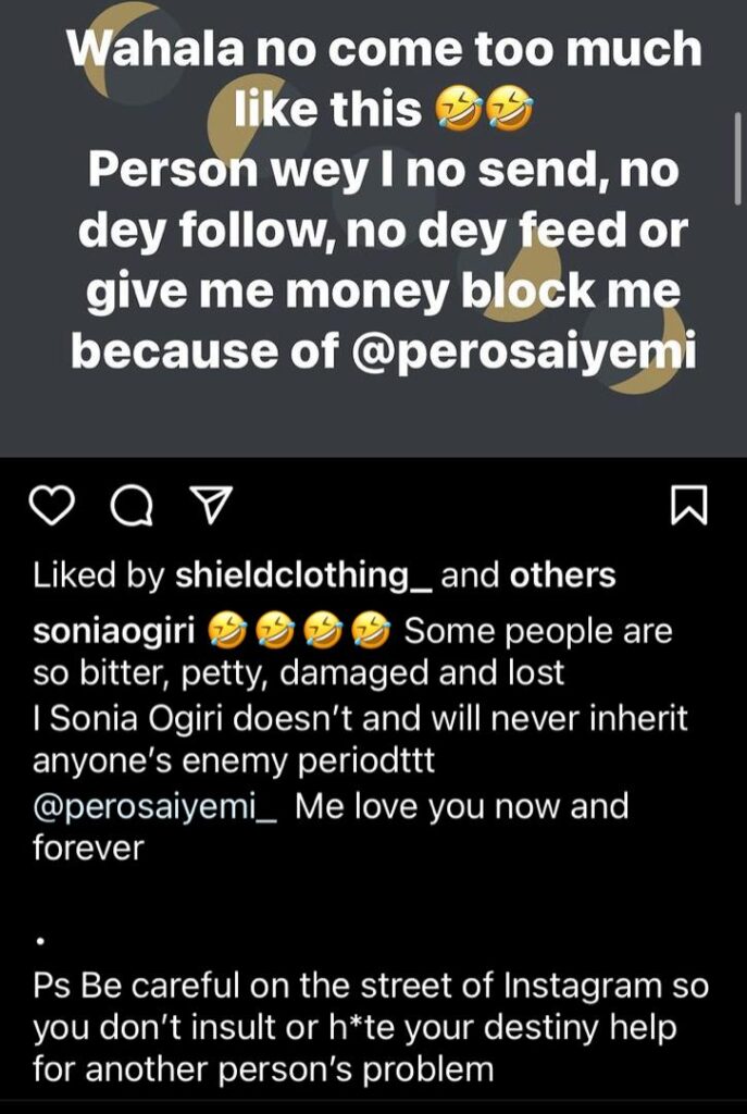 “Wahala no come too much like this. Person wey I no send, no dey follow, no dey feed or give me money block me because of @perosaiyemi,” she wrote in an Instagram post.