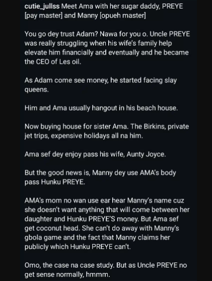 - A gossip blogger recently revealed that Ama Reginald’s alleged sugar daddy is Preye in an Instagram post.
