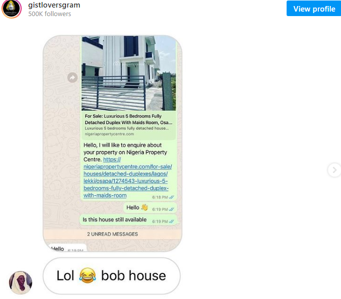 Controversial blogger, Gistlovers who accused the socialite of living a fake life and flaunting unreal riches shared a link that advertised the mansion for purchase. The post is said to have been made by the property agent.