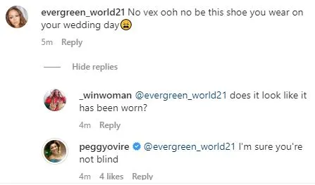 An Instagram user identified by her handle as @evergreen_world21 wrote: “No vex ooh no be this shoe you wear on your wedding day?”
