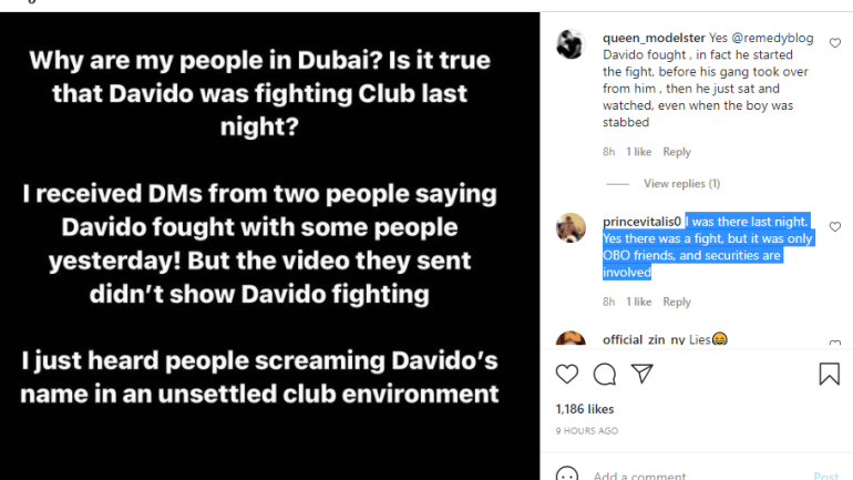 However, another Instagram user who also happened to be at the club when it happened also stated that Davido did not fight but rather his crew started the fight. She also wrote, “I was there last night. Yes there was a fight, but it was only OBO friends, and securities are involved”.