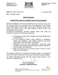 Botswana Government says on Friday that the country has registered its first ever suspected case of the deadly Coronavirus.