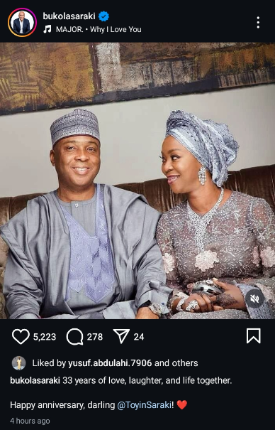 Former Senate President Bukola Saraki is joyfully celebrating 33 wonderful years of marriage with his dear wife, Toyin.