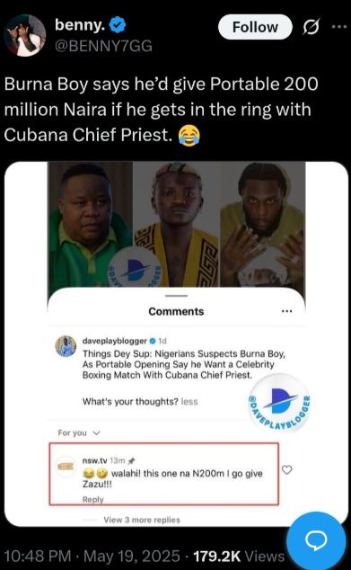 “Burna Boy says he’d give Portable 200 million Naira if he gets in the ring with Cubana Chief Priest. 😂”