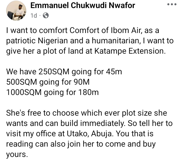 A businessman has pledged to gift a plot of land in Abuja to Comfort Emmanson, the viral Ibom Air passenger.