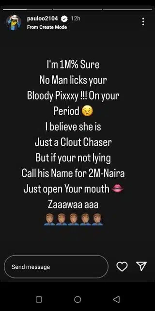 However, Paulo Okoye who finds it unbelievable has dared Monalisa Stephen to mention the name of her supposed boyfriend who does oral sex with her in her period.