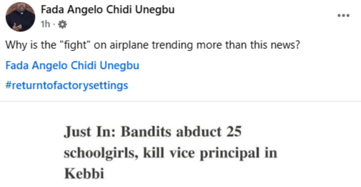 “It seems that some people are deliberately promoting these diversionary tactics on Nigerian social media to prevent people from discussing the country’s real problems. Today, it is fighting on airplanes. Stop falling for all these distractions,” he wrote.