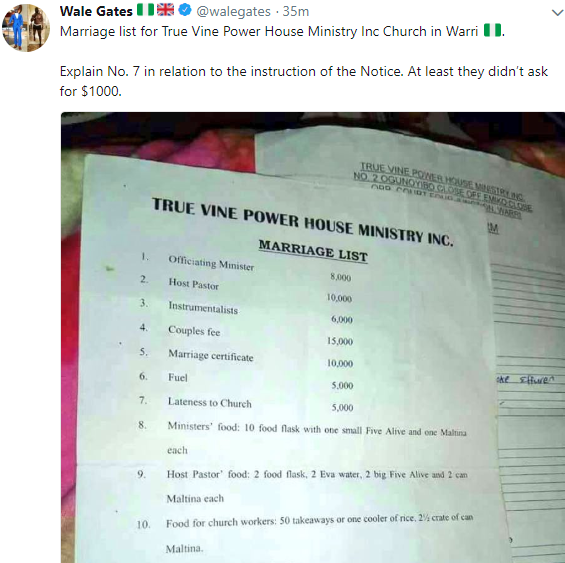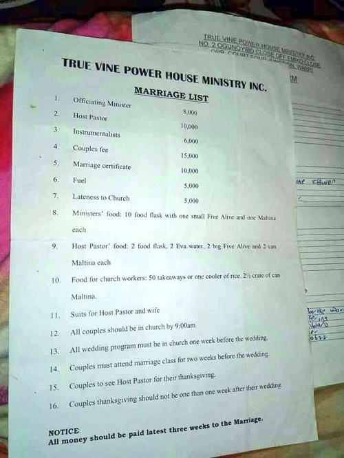 A church in Warri known as the True Vine Power House Ministry Incorporation has released a marriage list for those intending to get wedded in its church. The church also gave a stern warning that all the money should be paid 3 weeks to the marriage.