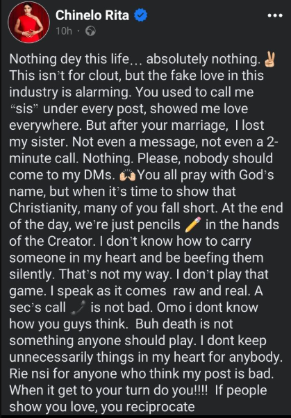 In an emotional and detailed Facebook post, Chinelo opened up about the heartbreaking experience of losing her sister shortly after Ruby’s recent wedding to actor Moc Madu. She used the moment to expose what she described as the fake and insincere attitudes prevalent in the entertainment industry.