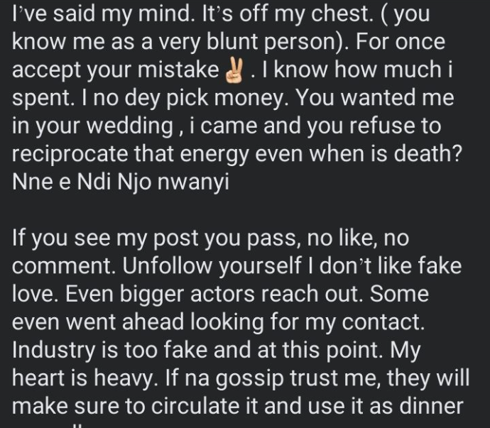 The emotional call-out has since stirred conversations online, revealing deeper issues of loyalty, friendship, and empathy among Nollywood stars.