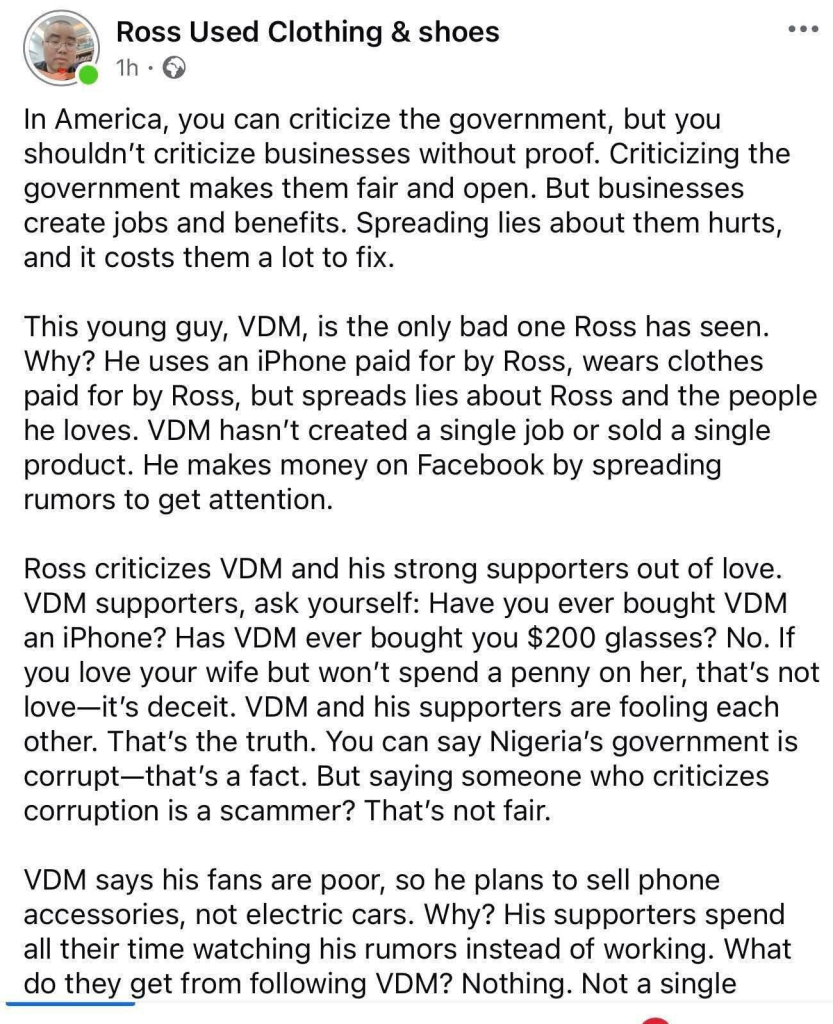 Ross criticizes VDM and his strong supporters out of love. VDM supporters, ask yourself: Have you ever bought VDM an iPhone? Has VDM ever bought you $200 glasses? No. If you love your wife but won’t spend a penny on her, that’s not love it’s deceit. VDM and his supporters are fooling each other. That’s the truth. You can say Nigeria’s government is corrupt that’s a fact. But saying someone who criticizes corruption is a scammer? That’s not fair.