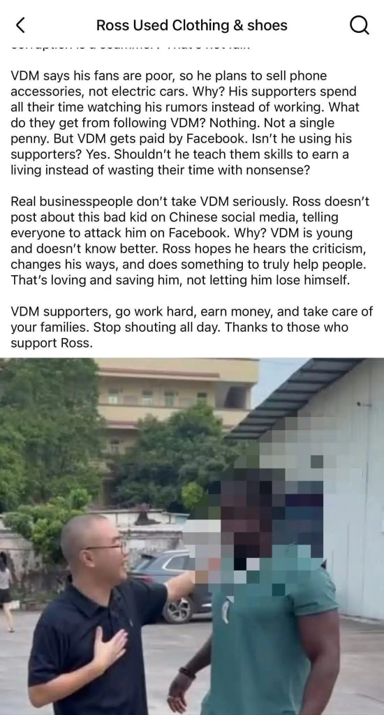 Chinese businessman, Ross Boss, has called out Nigerian social media activist Verydarkman (VDM) for allegedly spreading false information about businesses to attract online attention.