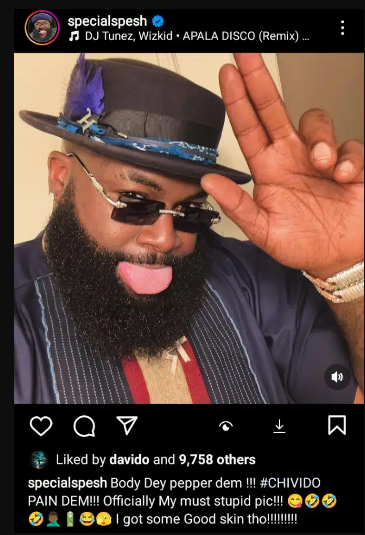 His words: “Body Dey pepper dem !!! #CHIVIDO PAIN DEM!!! Officially My must stupid pic!!! I got some Good skin tho!!!!!!!!!”