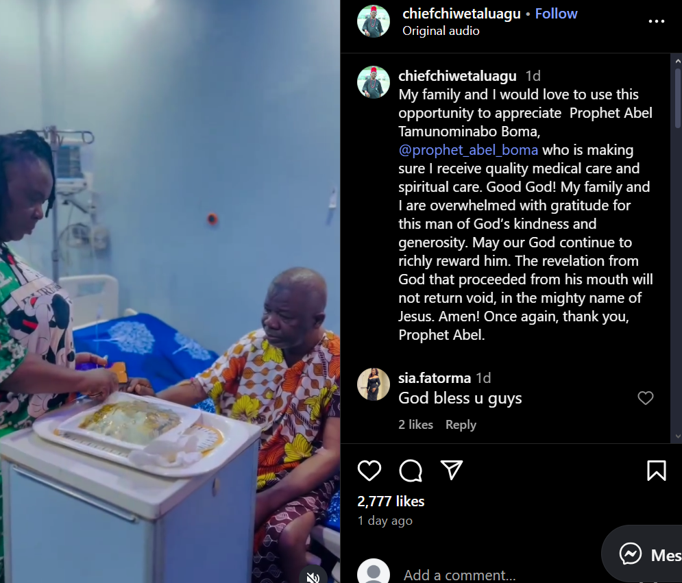 “My family and I would love to use this opportunity to appreciate Prophet Abel Tamunominabo Boma, @prophet_abel_boma, who is making sure I receive quality medical and spiritual care. Good God! My family and I are overwhelmed with gratitude for this man of God’s kindness and generosity. May our God continue to richly reward him. The revelation from God that proceeded from his mouth will not return void, in the mighty name of Jesus. Amen! Once again, thank you, Prophet Abel.”