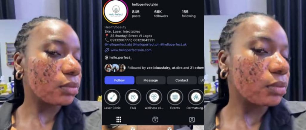 A Nigerian lady has taken to social media to share her distress after reportedly suffering permanent facial scars following a procedure at Hello Perfect Aesthetic & Laser Clinic.