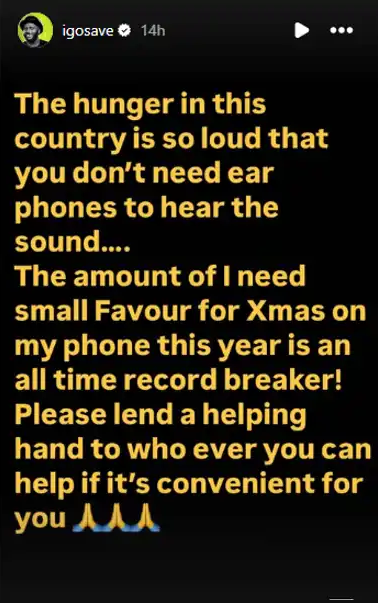 Nigerian comedian Otaghware Otas Onodjayeke, known as IGoSave, has expressed concern about the rising hunger in the country as Christmas approaches.