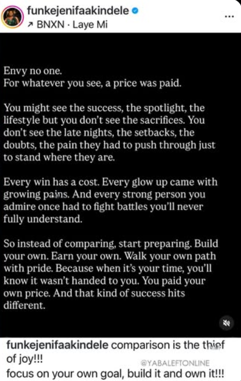 Nollywood star Funke Akindele has urged fans to stop comparing themselves to others, reminding them that true joy comes from focusing on their own goals.