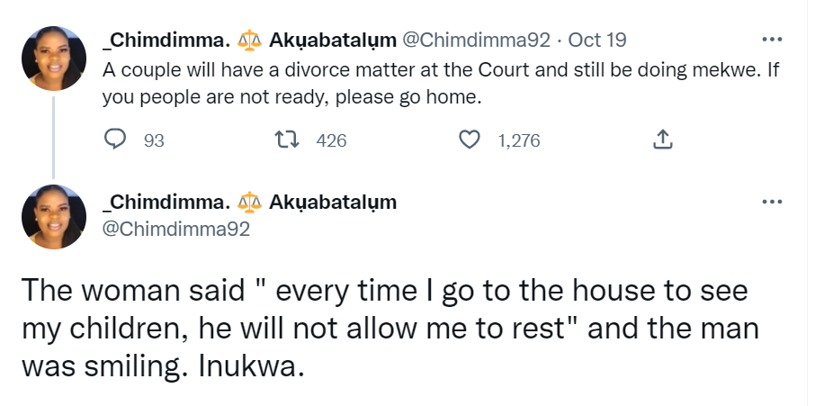 Recounting a recent experience in court, @_Chimdimma92 stated that one cannot be having sexual relations and want divorce at the same time.