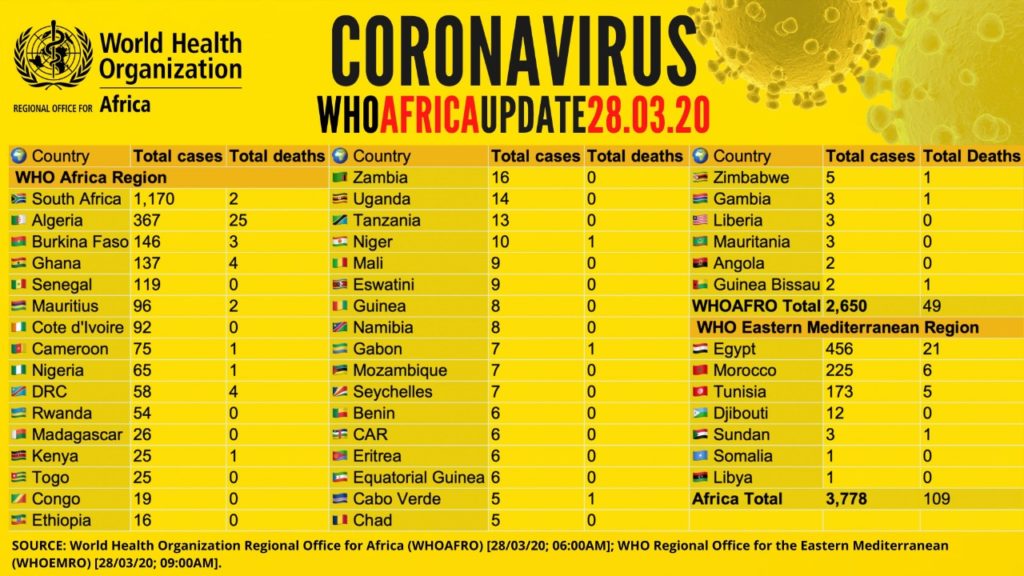 The World Health Organisation (WHO) Regional Office for Africa in Brazzaville, Congo, says there are now 3,778 confirmed cases of coronavirus (COVID-19) in 46 out of 54 African countries.