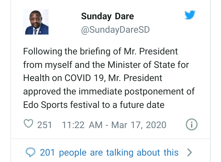 He wrote: Following the briefing of Mr. President from myself and the Minister of State for Health on COVID19, Mr. President approved the immediate postponement of Edo Sports festival to a future date.’
