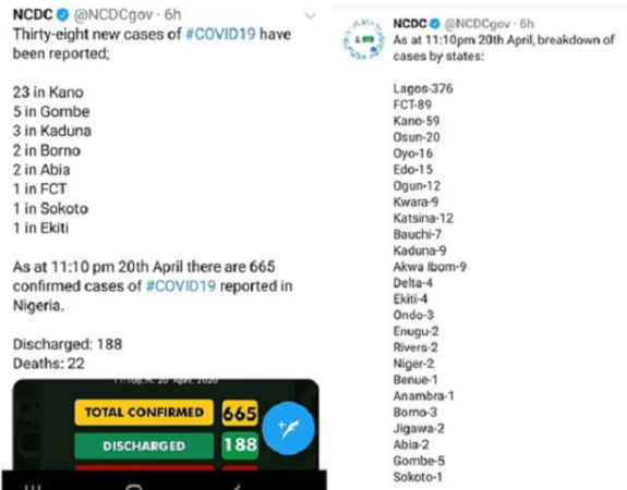 “As at 11:10 pm 20th April, there are 665 confirmed cases of #COVID19 reported in Nigeria.