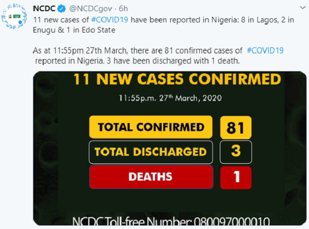 The Nigeria Center for Disease Control NCDC, said of the 11 cases, eight were detected in Lagos, two in Enugu and one in Edo state.