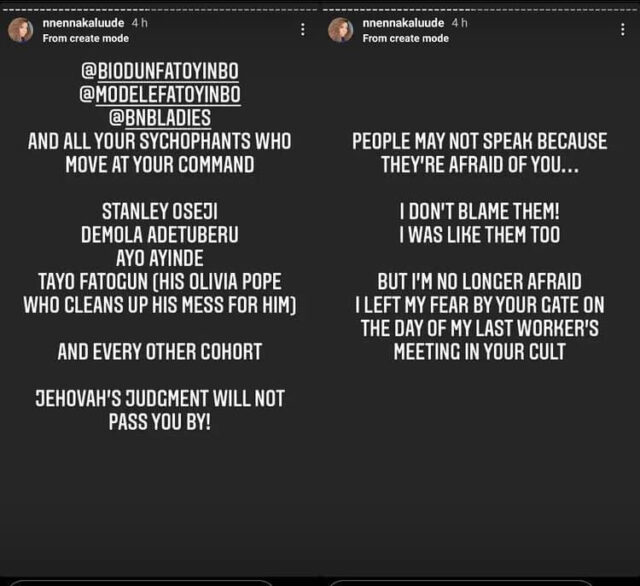 Alleging that people who want to speak up about the “evil” going on in the church either fall ill or die mysteriously, Nnenna further asked if Pastor Biodun Fatoyinbo has joined an occultic group.