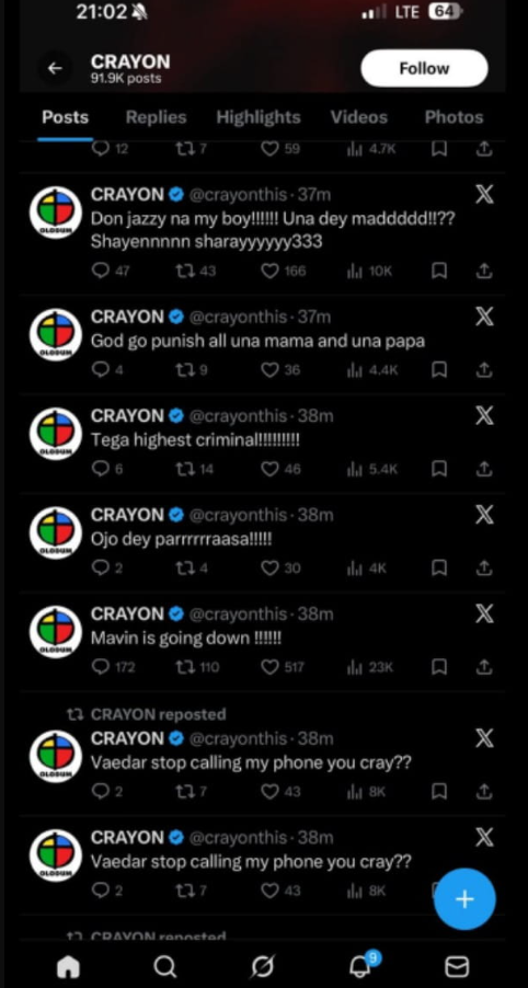 Nigerian singer and songwriter Crayon has publicly criticized his former label boss Don Jazzy and Mavin Records in a series of posts shared on social media.