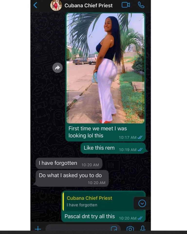 Gistlovers wrote; ‘‘Two girls wey Dey my dm now , one Na from Kenya, that one Na Cubana chiefpriest give am belle , she don almost due sef yet Cubana chief priest Dey run , no want make the wife know.