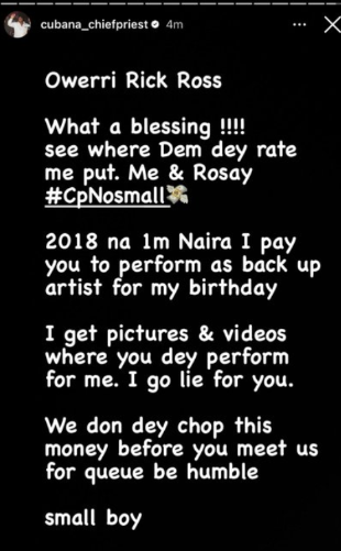 We don dey chop this money before you meet us for queue be humble small boy.” Cubana Chief Priest wrote.