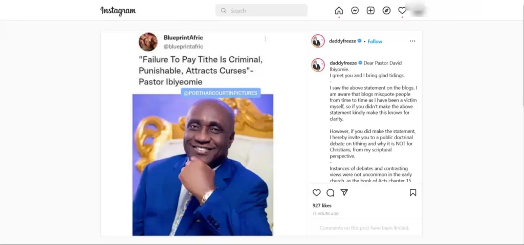 Daddy Freeze made this known on his Instagram page while reacting to a statement he made where he condemned non-tithers.