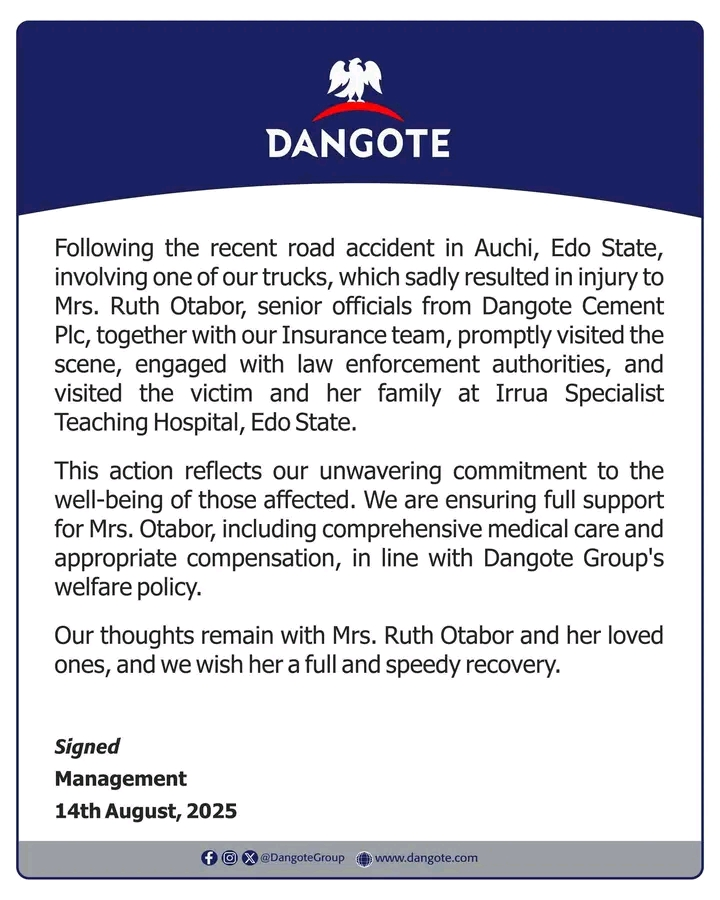 “Following the recent accident in Auchi, Edo State, which sadly resulted in injury to Mrs. Ruth Otabor, senior officials from Dangote Cement PLC, together with our insurance team, promptly visited the scene and engaged with law enforcement agencies,” the statement said.