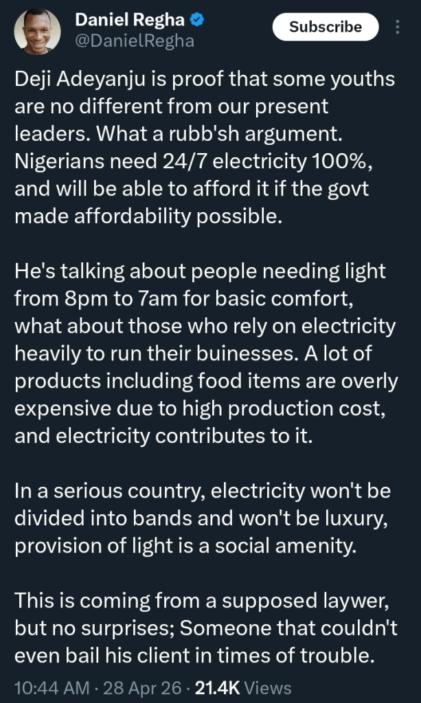 Regha said, “Deji Adeyanju is proof that some youths are no different from our present leaders. What a rubb’sh argument. Nigerians need 24/7 electricity 100%, and will be able to afford it if the govt made affordability possible.”