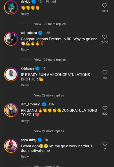 The likes of Davido, Obi Cubana and others took to the comment section to hail the entrepreneur.