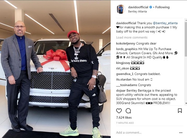 Nigerian music superstar, Davido who is currently in Atlanta has taken to his Instagram page to share this new photo of him showing off his newly purchased 2018 Bentley Bentayga.